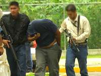 Agentes de la Procuradur�General de la Rep�a trasladan a un miembro de Los Zetas FOTO Ivan S�hez /La Jornada Michoac�