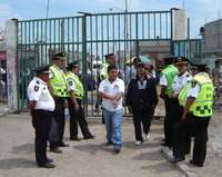 Polic� preventivos vigilan los cuatro accesos al deportivo Herreros del municipio de Chimalhuac� donde el alcalde Miguel Angel Casique rindi� informe de labores FOTO Ren�am�