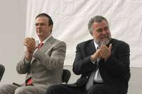El jefe de Gobierno del Distrito Federal, Alejandro Encinas, estuvo acompa� del secretario de Desarrollo Social, Marcelo Ebrard, durante la entrega de becas a estudiantes en el Z�o FOTO Francisco Olvera
