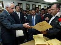 Miguel Angel Guti�ez, presidente de la Junta Federal de Conciliaci� Arbitraje, recibe de Roberto Vega Galina, l�r del SNTSS, el emplazamiento a huelga de los trabajadores del IMSS FOTO Carlos Cisneros
