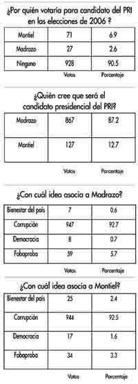 A LA PREGUNTA "¿Por quién votarías como candidato del PRI en las elecciones de 2006?", 90.4 por ciento de mil 26 encuestados contestó: "Por ninguno". Sólo 7 por ciento dijo que por el candidato del Tucom, Arturo Montiel, y 2.6 se inclinó por Madrazo. No obstante que la tendencia favoreció al todavía gobernador del estado de México, a la pregunta "¿Quién cree que será el candidato presidencial del PRI?", 87.2 por ciento respondió que Madrazo. Poco más de 90 por ciento de los participantes en el sondeo de opinión asocian a los dos precandidatos priístas con la idea de "corrupción".