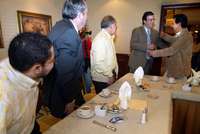 Los l�res del PRD local Mart�atres, y nacional, Leonel Cota, y Armando Quintero, observan el saludo de Marcelo Ebrard y Jes�tega, durante la reuni�e los dirigentes perredistas con los cuatro precandidatos de ese partido al GDF FOTO Jos�ntonio L�