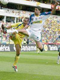 El americanista Germ�Villa (izquierda) tuvo mucho trabajo en la media cancha FOTO Luis Humberto Gonz�z