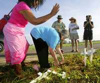 Madres de soldados estadunidenses ca�s en Irak levantan las cruces que hab� colocado en un campamento frente al rancho del presidente George W. Bush en Crawford, Texas, y que un hombre aplast�n su camioneta la noche del lunes FOTO Ap