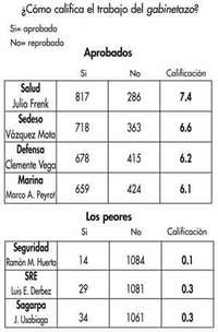 SOLO CUATRO SECRETARIOS de Estado del gabinetazo del presidente Fox resultaron aprobados en la antiencuesta de esta semana en la que participaron mil 111 ciudadanos: Julio Frenk, de Salud; Josefina Vázquez Mota, de Sedeso; el general Clemente Vega, de la Defensa, y el almirante Marco A. Peyrot, de Marina. La peor calificación la obtuvo Ramón Martín Huerta, titular de la Secretaría de Seguridad Pública. La frustración, el enojo, la desilusión de los ciudadanos se refleja en una boleta de calificaciones en que varios miembros del gabinetazo estuvieron cerca de sacar cero.