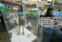 Enjaulada y portando sólo brasier y pantaleta, bajo una tenue pero persistente lluvia, junto a su compañera de causa, Minia Reyes -con un disfraz de ave- y apoyada por otros integrantes de GARRA y Súper Animal, insistió en que todos los circos con animales violentan las disposiciones establecidas en el ordenamiento internacional Acta de Bienestar Animal (AWA, por sus siglas en inglés), el cual indica que éstos deben tener suficiente espacio para pararse y voltearse cuando están encerrados.