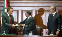 El gobernador del Banco de M�co, Guillermo Ortiz; el presidente de la Corte, Mariano Azuela, y el secretario de Comunicaciones, Pedro Cerisola, durante la ceremonia de recepci�el Archivo Ignacio L. Vallarta FOTO Mar�Luisa Severiano