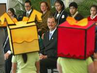 El presidente Vicente Fox observa la representaci�e la obra Un nuevo amigo, protagonizada por menores con discapacidad FOTO Marco Pel�
