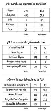 EL JUEVES PROXIMO el presidente Fox rendirá su penúltimo Informe de gobierno -el quinto-; sólo restarán 15 meses en el calendario del sexenio. La mayoría de las mil 193 personas que participaron en la antiencuesta de esta semana opina que Fox no cumplió ninguna de sus promesas o sólo cumplió algunas. ¿Qué es lo mejor de su sexenio? La abstención en la ONU en el asunto de Irak. ¿Y lo peor? La opinión mayoritaria se pronuncia así: la señora Marta y sus hijos, el saqueo del Fobaproa y la combinación de inseguridad, narcotráfico y corrupción.