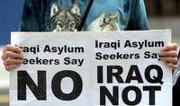 Un miembro de la Federaci�nternacional de Refugiados Iraqu� se manifiesta en las afueras de oficina de Blair FOTO Reuters
