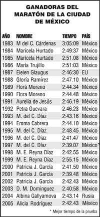 En el kilómetro 37, la mexiquense Alicia Rodríguez, madre de tres hijos, dio alcance a la keniana Dina Kipkoech para adjudicarse la edición 23 del maratón capitalino, con tiempo de 2:42.43 horas, y superar por dos segundos a su rival, en una carrera en la que por primera vez las mujeres llegaron a la meta antes que los varones, debido al recorrido prácticamente plano, aunque no se mejoraron las marcas como se esperaba.