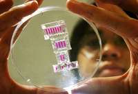 Un ingeniero de Attogenix Biosistemas sostiene una muestra de un reciente desarrollo de AttoChips en Singapur. El fondo gubernamental de desarrollo biotecnol�o dijo que est�desarrollando un chip pl�ico del tama�e un centavo de d� que analiza muestras de ADN de genes y virus y realiza m�les pruebas simult�as para identificar diferentes tipos de dengue FOTO Ap