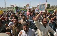 Manifestantes marchan en Albon Diyab, cerca de Ramadi, en apoyo a Saddam Hussein y al cl�go Muqtada Sadr FOTO Ap