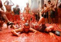 Ampliar la imagen Cerca de 40 mil personas se congregaron en la peque�iudad espa� de Bu�para protagonizar la mayor guerra de tomates del mundo, conocida como la Tomatina. Protegidos con m�aras y gafas, los llamados guerreros se bombardearon con 130 toneladas del producto FOTO Reuters Foto: Reuters