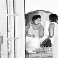 LA DE ARRIBA ES una foto pésima y anónima que podría decir poco: una señora negra y panzona que se retoca el maquillaje o se limpia un diente frente al espejo. Tal vez la mujer se ha roto el lomo durante muchos años, como cajera de una tienda o afanadora de una oficina, para amueblar su casa con algo más que decoro. La protagonista no se enteró que estaba siendo fotografiada y el autor de la gráfica (¿un hijo? ¿su pareja?) operó de manera furtiva. La retomé, al igual que las otras de este día, del sitio www.mojo.net, en el que se ofrecen imágenes de dominio público. Son escenas cotidianas que no se repetirán nunca porque ocurrieron, hace tres años, en un lugar que ya no existe. Quién sabe si los fotógrafos y sus modelos sigan vivos. A saber si el marco del espejo y el tocador de la primera gráfica forman parte, ahora, de los fragmentos incoherentes de madera que aparecen en las fotos del desastre llamado Nueva Orleáns.