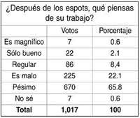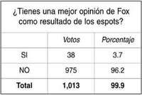 SOLO 38 PERSONAS de las mil 13 que participaron en la antiencuesta de esta semana afirman que tienen una mejor opinión del presidente Vicente Fox como resultado de los espots que se transmiten desde antes del quinto Informe de gobierno, en una de las más intensas campañas de propaganda de que se tiene memoria. La mayoría no ha cambiado la opinión sobre el desempeño del mandatario que tenía desde antes de la campaña: 670 personas piensan que es pésimo; para 225 es malo, y 86 opinan que es regular. En otras palabras: ha gastado la Presidencia muchos millones de pesos en mejorar su imagen, pero no ha recogido la cosecha que esperaba.
