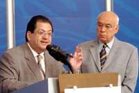 El coordinador del equipo t�ico del informe sobre desarrollo humano en M�co, Luis Felipe L� Calva, y Rub�Aguilar Valenzuela, vocero de la Presidencia de la Rep�a, durante la conferencia de prensa de ayer FOTO Notimex