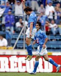 La M�ina no puede bajar ni un poquito el pist�afirm�rardo Torrado. En la gr�ca, festeja su anotaci�el s�do; a su derecha, el Chelito Delgado FOTO Reuters