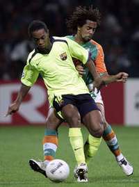 Ronaldinho, del Barcelona (izquierda), gana la jugada a Patrick Owomoyela del alem�Bremen FOTO Ap