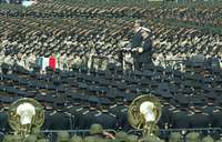 El secretario de la Defensa Nacional, Ricardo Clemente Vega; el presidente Vicente Fox, y el secretario de Marina, Marco Antonio Peyrot, en el pase de lista a integrantes de las fuerzas armadas en el Z�o capitalino, previo al desfile militar en el que participaron 15 mil 165 elementos del Ej�ito y la Armada FOTO Jos�arlo Gonz�z