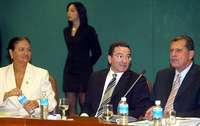 El dirigente nacional del PRI, Mariano Palacios Alcocer, durante una reuni�on los senadores de su partido. En la gr�ca es flanqueado por Dulce Mar�Sauri y Enrique Jackson FOTO Marco Pel�