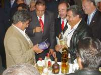 En la primera Feria Nacional de Sistemas-Producto, el presidente de la Uni�acional de Trabajadores Agr�las (UNTA), Alvaro L� R�, muestra al secretario Javier Usabiaga uno de los agroproductos elaborados por integrantes de esa agrupaci�