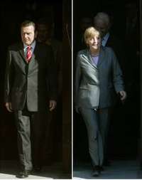 Gerhard Schroeder y Angela Merkel, luego de su encuentro en Berl�para negociar un gobierno de coalici�di�go que no rindi�utos pues ambos exigen el cargo de canciller federal FOTO Reuters