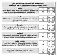 PARA UN CANDIDATO presidencial que desafió a las autoridades electorales al arrancar su campaña portando el estandarte de la Virgen de Guadalupe; para un Presidente que al ir a rendir su protesta primero fue a arrodillarse ante el altar en la Basílica; para un jefe de Estado que se arrodilló ante otro jefe de Estado -Juan Pablo II- para recibir su bendición, sin duda debe ser una experiencia penosa que su gobierno reciba la condena del nuevo papa Benedicto XVI. ¿Qué piensan los mexicanos respecto al severo juicio del nuevo jefe de la Iglesia católica sobre la situación que prevalece en el gobierno de Vicente Fox? El 94 por ciento de 988 personas que participaron en la encuesta de esta semana -entre las que se cuentan católicos, miembros de diversos grupos religiosos e inclusive ateos declarados- dan la razón al Papa.