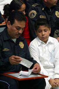 Un polic�revisa el cheque correspondiente a la beca de su hijo, que recibi�er del secretario de Seguridad P�a del DF, Joel Ortega FOTO Jos�ntonio L�