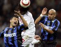 Los argentinos del Inter de Mil� Walter Samuel (izquierda ) y Sebasti�Ver�disputan el bal�on Luca Tori, del Fiorentina FOTO Ap
