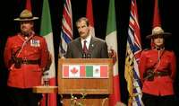 El presidente Vicente Fox flanqueado por dos integrantes de la Real Polic�Montada canadiense en Vancouver, en Columbia Brit�ca, en su segundo d�de visita a este pa�FOTO Reuters