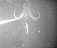 OCURRIO ASI: LOS científicos, sabedores de que los calamares gigantes y los cachalotes mantienen una vieja enemistad, siguieron a un grupo de estos cetáceos hacia sus sitios habituales de alimentación. Colgaron de su embarcación dos cuerdas: una con un cebo compuesto por calamares comunes y camarones, y otra con una cámara. El 30 de septiembre -hace un año, pues- un calamar de más de ocho metros de largo atacó el cebo y quedó temporalmente atrapado. El monstruo, espécimen del género Architeuthis, consiguió liberarse tras varias horas de lucha, pero antes de escapar perdió un tentáculo en el forcejeo. Los investigadores subieron de inmediato el apéndice a la embarcación, y notaron que éste "presentaba aún signos de vida y las ventosas no paraban de succionar la cubierta del barco y de cualquier objeto que se pusiese a su alcance".