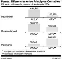 De esta forma, mientras que bajo los PCGA los pasivos de Pemex son de 491 mil millones de pesos, hasta el cierre de 2004, bajo las normas de gubernamentales estos pasivos son de 103 mil millones de pesos. Asimismo, bajo los PCGA la reserva laboral es de 305 mil millones de pesos, mientras que con base en las NIF, ésta totaliza 187 mil millones de pesos. Con ello, el patrimonio de Pemex se sitúa en 33 mil millones de pesos bajo los Principios de Contabilidad, y en 260 mil millones de pesos bajo las Normas de Información Financiera.