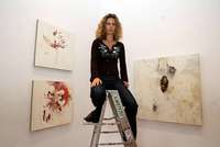 Sandra Pani con algunas de sus obras incluidas en la muestra de la artista que se inaugura en el recinto de Alvaro Obreg�9, colonia Roma FOTO Cristina Rodr�ez