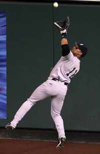 El jardinero derecho Gary Sheffield se aplica para echar fuera a Orlando Cabrera de los Serafines, al cierre de la octava entrada FOTO Reuters