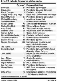 En el número uno de la lista está situado Bill Gates, presidente de Microsoft, de quien el diario destaca no sólo su fortuna, 51 mil millones de dólares, sino su actividad filantrópica y dominio del mercado mundial: 9 de cada 10 computadores en el mundo utiliza su sistema operativo Windows.