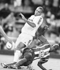 El brasile�onaldo, del Real Madrid, esquiva la barrida del colombiano Luis Perea, del Atl�co FOTO Ap