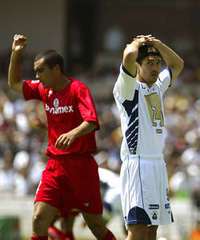 Mientras Edgar Due� del Toluca, celebra la anotaci�el puma Marioni se lamenta FOTO Ap