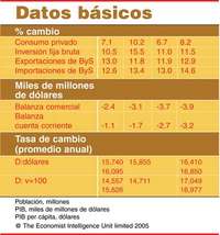 Sector externo. Hasta ahora los ingresos por exportación se han mantenido fuertes -20 mil 400 mdd (cifras aduanales) de enero a agosto de 2005-, 18.7% más que en el mismo periodo del año anterior. Las exportaciones continuarán su rápida expansión durante 2005, pero su ritmo de crecimiento disminuirá en 2006, debido sobre todo a la caída de los precios globales del crudo. A pesar de la expansión en los ingresos por exportaciones, es de prever que el déficit comercial se incremente en el periodo 2005-2006 impulsado por un rápido crecimiento en importaciones. En los primeros ocho meses de 2005 la factura de importaciones creció 20% en comparación con el mismo periodo del año anterior, a 24 mil 200 mdd (cifras aduanales). Aunque el valor de las importaciones de los productos derivados del petróleo se ha incrementado fuertemente, el crecimiento de las importaciones fue causado también por un alza en las importaciones de bienes de capital e inversiones productivas, tendencia que refleja el auge actual de la confianza en los negocios.
