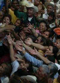 Asistentes al acto proselitista de Andr�Manuel L� Obrador en Uruapan, Michoac� saludan al tabasque�FOTO Carlos Ramos Mamahua