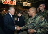 Donald Rumsfeld, secretario de Defensa estadunidense, declar�tar de acuerdo en aumentar la responsabilidad de Se� la defensa de la pen�ula coreana. La imagen muestra al funcionario durante una reuni�on soldados estadunidenses en el pa�asi�co FOTO Reuters
