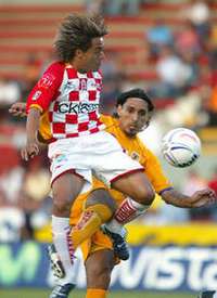 El jugador de Tecos Alejandro Villalobos despeja el bal�nte el asecho de Andr�Silvera FOTO Ap