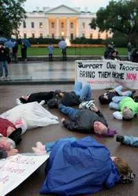 A las 18 horas, Sheehan, madre de un soldado muerto en combate en Irak que se ha convertido en la figura principal del movimiento antiguerra, y unos cuantos activistas más realizaron un simulacro de muerte frente a la Casa Blanca.