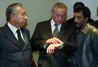 Los dirigentes de la CROC, Isa� Gonz�z; de la FSTSE, Joel Ayala; y del Congreso del Trabajo, V�or Flores, durante el velorio de Alberto Ju�z Blancas FOTO Jos�arlo Gonz�z