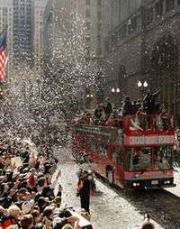 Chicago, 28 de octubre. En medio de un ambiente de euforia el equipo de Medias Blancas salió a recorrer las calles de Chicago para compartir su trofeo, tras 88 años de ausencia de título en la Serie Mundial, con los miles de aficionados que se dieron cita para festejar y rendir homenaje a los nuevos héroes del diamante.