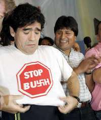 El ex futbolista Diego Armando Maradona y el pol�co boliviano Evo Morales participaron en la conferencia de prensa del grupo que se opone a la presencia de George W. Bush en Argentina FOTO Ap