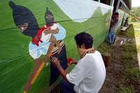 Un grupo formado por bases de apoyo zapatistas realiza un mural en la casa de la junta de buen gobierno del caracol de Morelia, Chiapas, en septiembre de 2004 FOTO Jos��