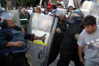 Los uniformados golpearon con sus toletes y escudos a los inconformes, mientras éstos trataban de repeler la acción con patadas y empujones. Uno de los manifestantes, Javier Cabañas, resultó con una herida en la cabeza, en tanto varias mujeres comerciantes fueron empujadas por tratar de apoyar a los transportistas.