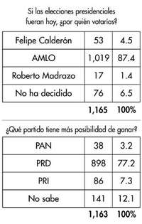 EN EL AMPLIO ESPECTRO político del centro y centro-izquierda, la intención de voto favorece abrumadoramente a Andrés Manuel López Obrador. A la pregunta "si las elecciones fueran hoy, ¿por quién votarías (en orden alfabético): Calderón, López Obrador o Madrazo, 87.4 por ciento de mil 165 personas encuestadas se inclinó por el ex jefe de Gobierno del Distrito Federal. La otra pregunta de la antiencuesta de la semana refleja el temor de que el todavía poderoso aparato priísta influya en los resultados a pesar de la popularidad de AMLO. El texto completo de los votos razonados puede ser consultado en el foro.