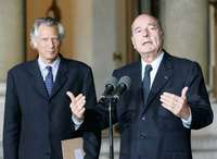 El presidente Jacques Chirac (derecha) habl�er por primera vez con los periodistas sobre los disturbios que afectan desde hace varios d� barrios pobres de Par�y otras provincias de Francia. Lo acompa�l primer ministro Dominique de Villepin FOTO Reuters